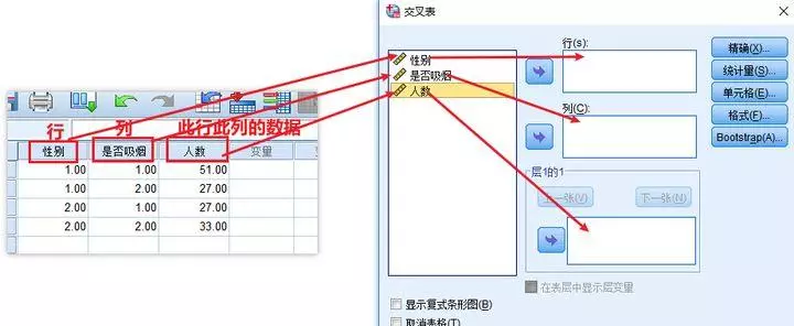 弹出交叉表操作对话框,按照下图的关系将三个变量放入对应的分析框中。